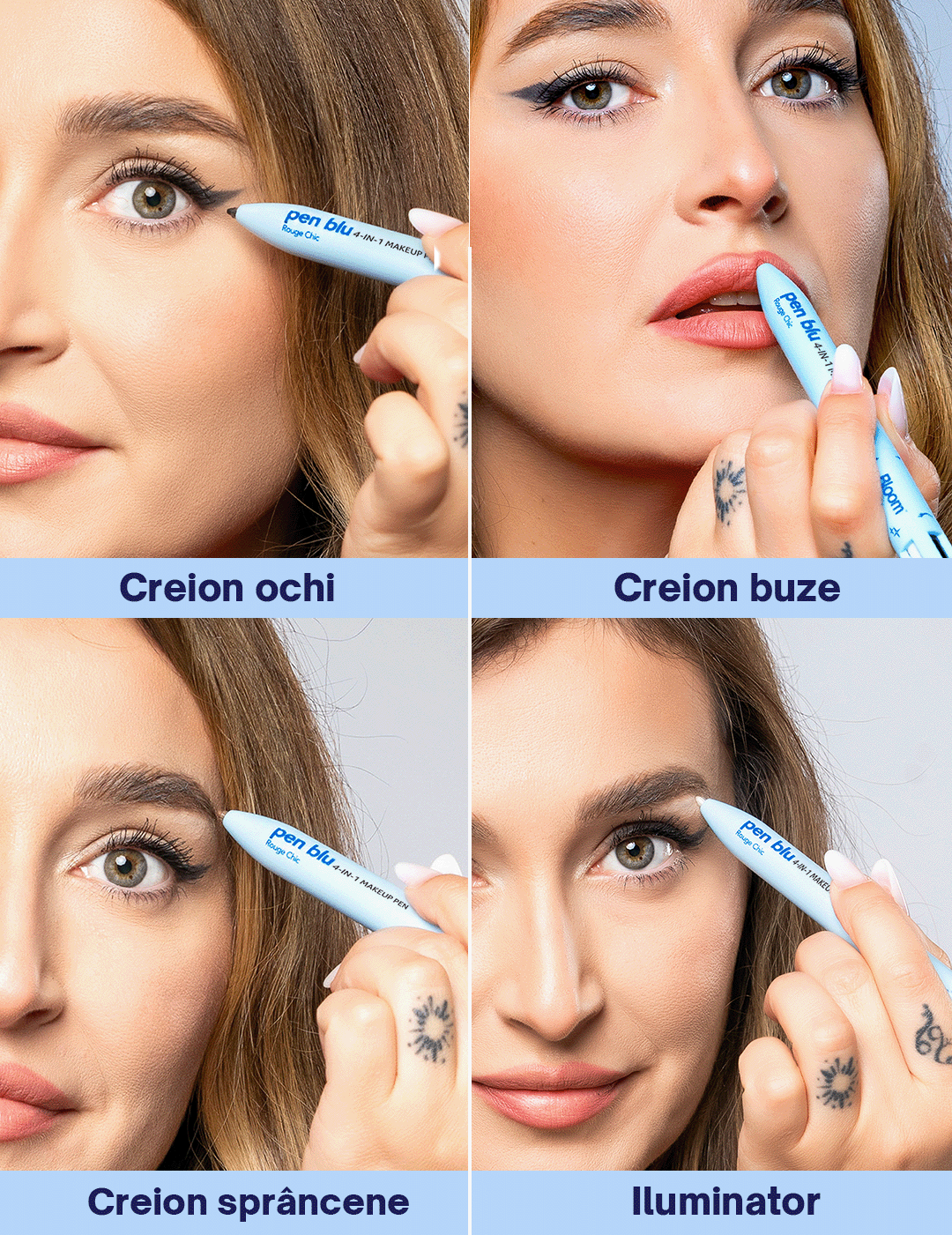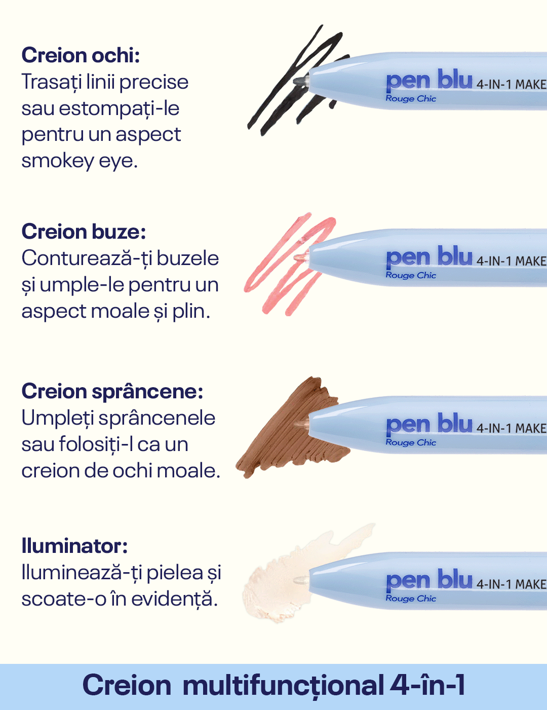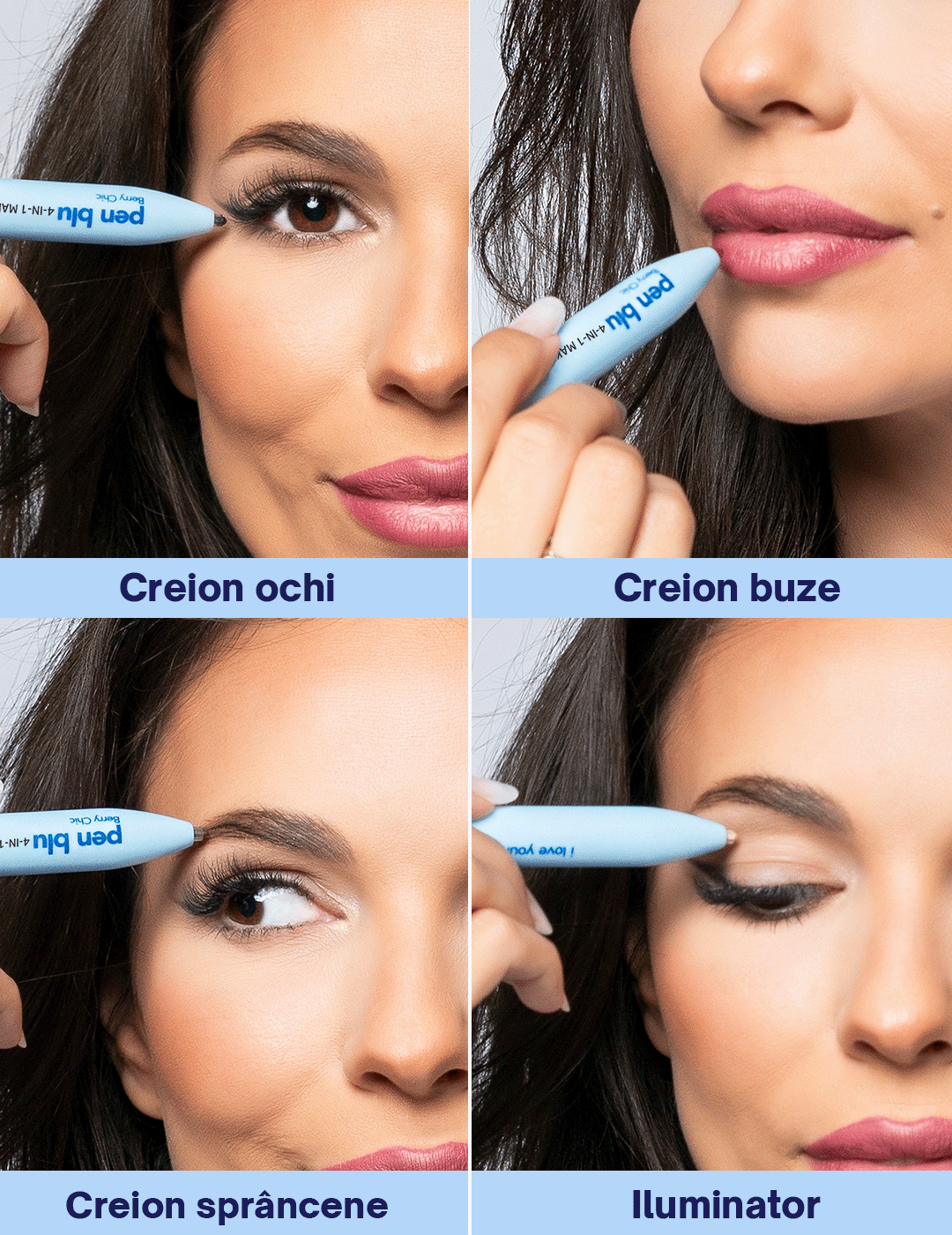 Descoperă patru produse esențiale de makeup într-un stilou ingenios, cu un design retro: creion pentru sprâncene, eyeliner, contur de buze și iluminator. Acest produs multifuncțional este un adevărat must-have, perfect pentru a-ți simplifica rutina de beauty și pentru a crea look-uri impecabile, oriunde te-ai afla.