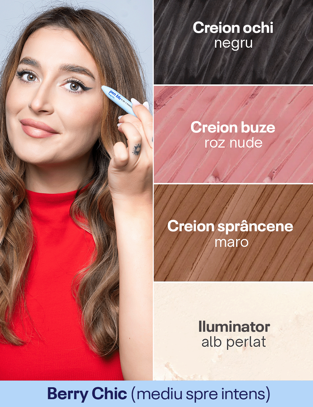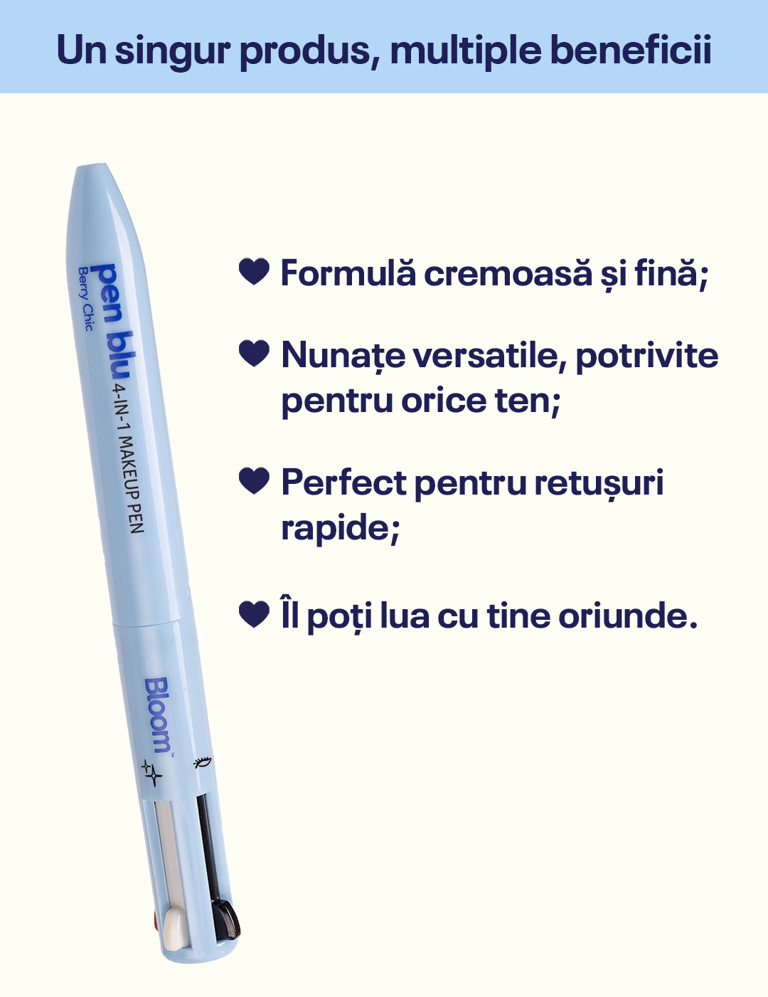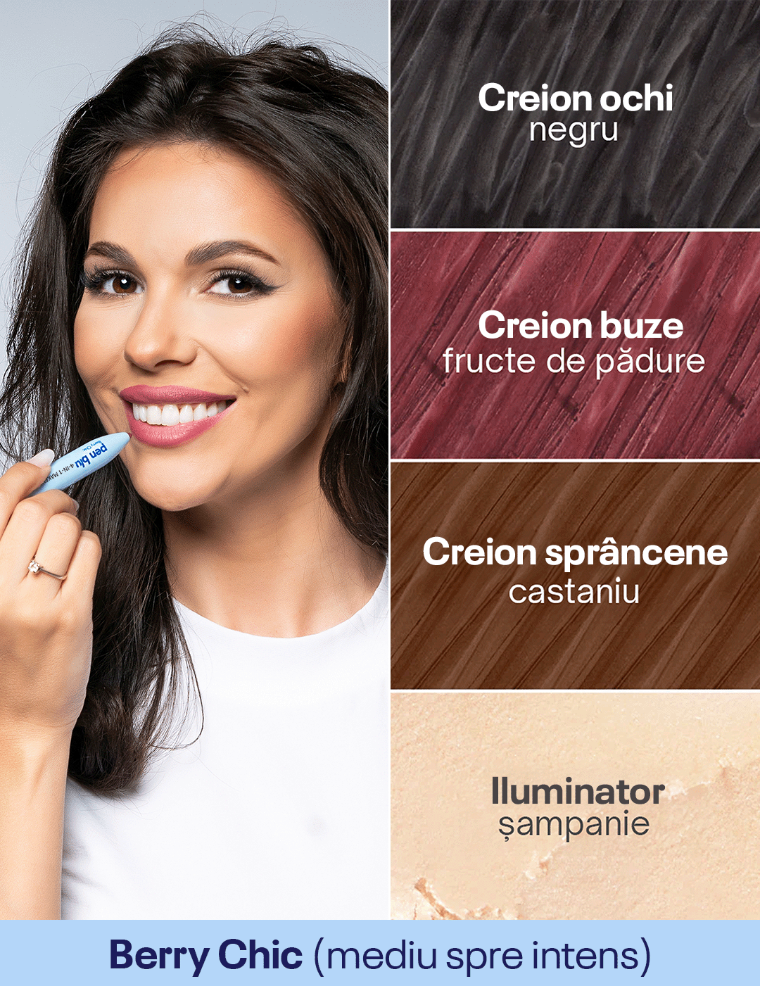 Descoperă patru produse esențiale de makeup într-un stilou ingenios, cu un design retro: creion pentru sprâncene, eyeliner, contur de buze și iluminator. Acest produs multifuncțional este un adevărat must-have, perfect pentru a-ți simplifica rutina de beauty și pentru a crea look-uri impecabile, oriunde te-ai afla.