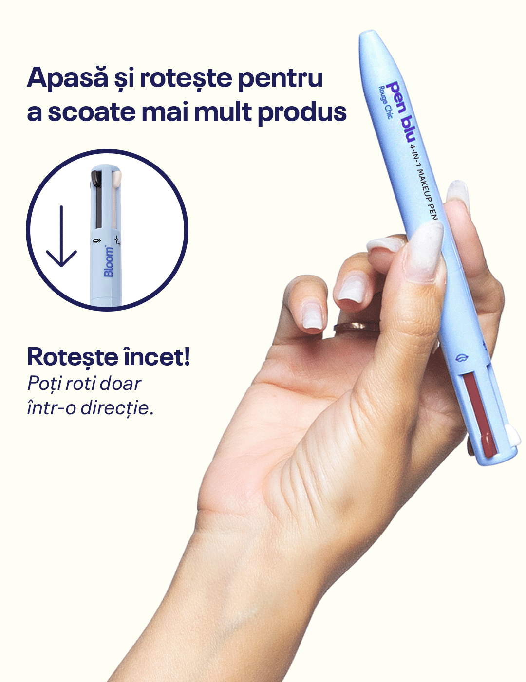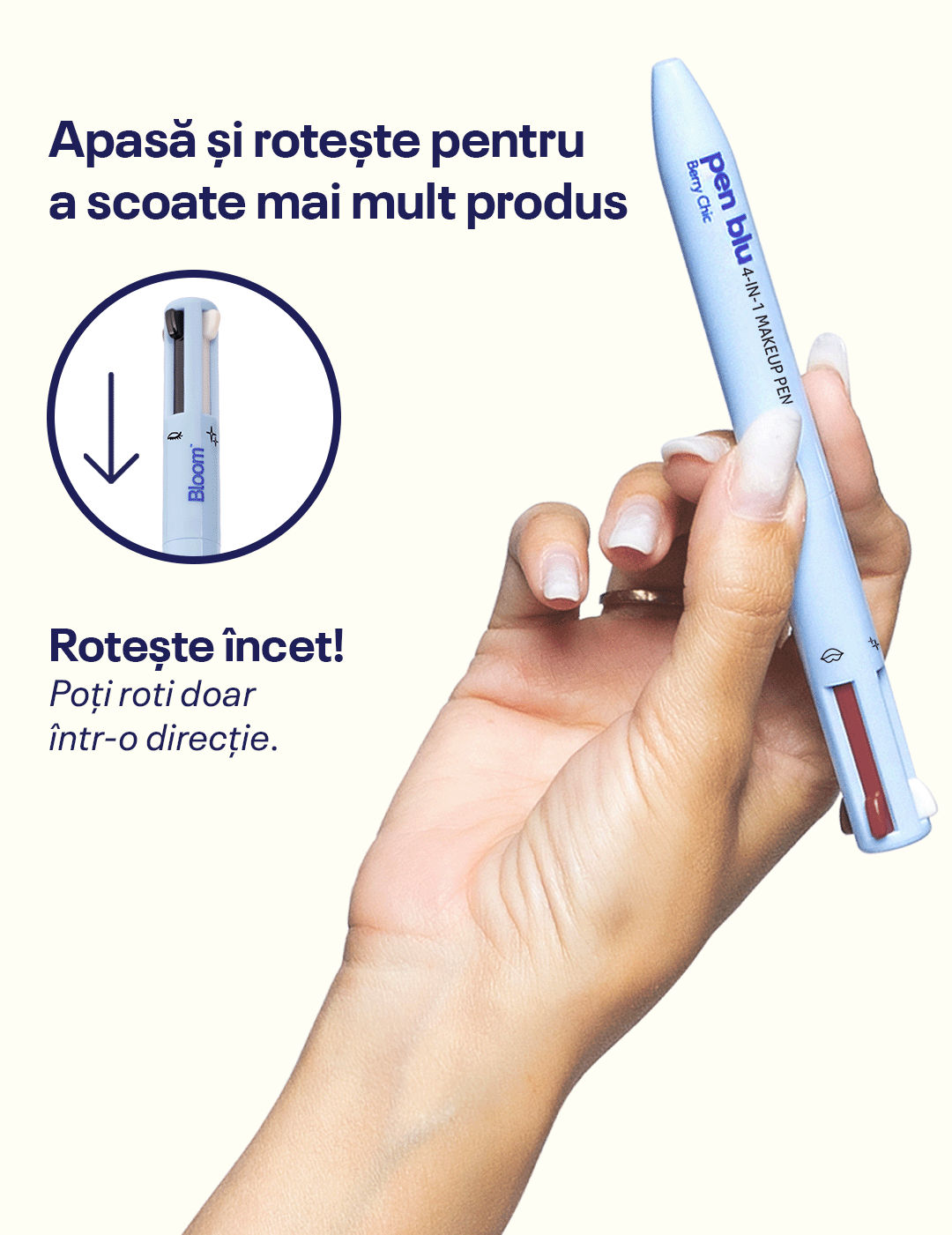 Când vârful rămâne fără produs, pur și simplu răsuceste stiloul în sensul acelor de ceasornic pentru a dezvălui mai mult produs. Vei fi surprins cât de mult este în acest mic stilou!